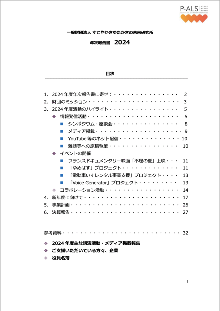 一般財団法人 すこやかさゆたかさの未来研究所の活動をまとめた年次活動報告書を、閲覧、PDFダウンロードいただけます。