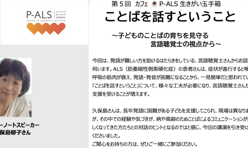 久保島さんは、長年発語に困難がある子どもを支援してこられ、現場は異なりますが、その中での経験や気づきが、病や高齢のためことばによるコミュニケーションが難 しくなってきた方たちとの対話のヒントとなるのではと感じ、今回の講演を引き受けてくださいました。