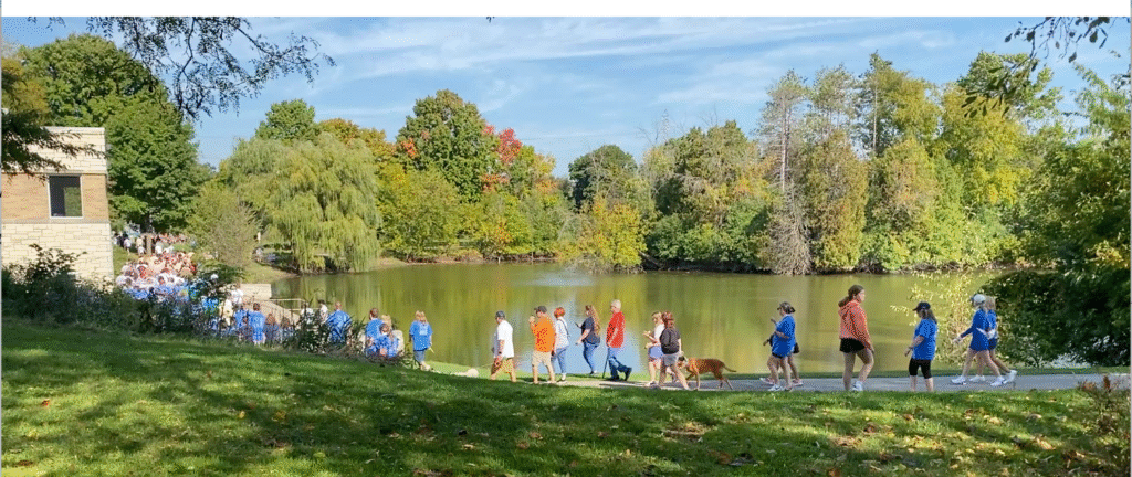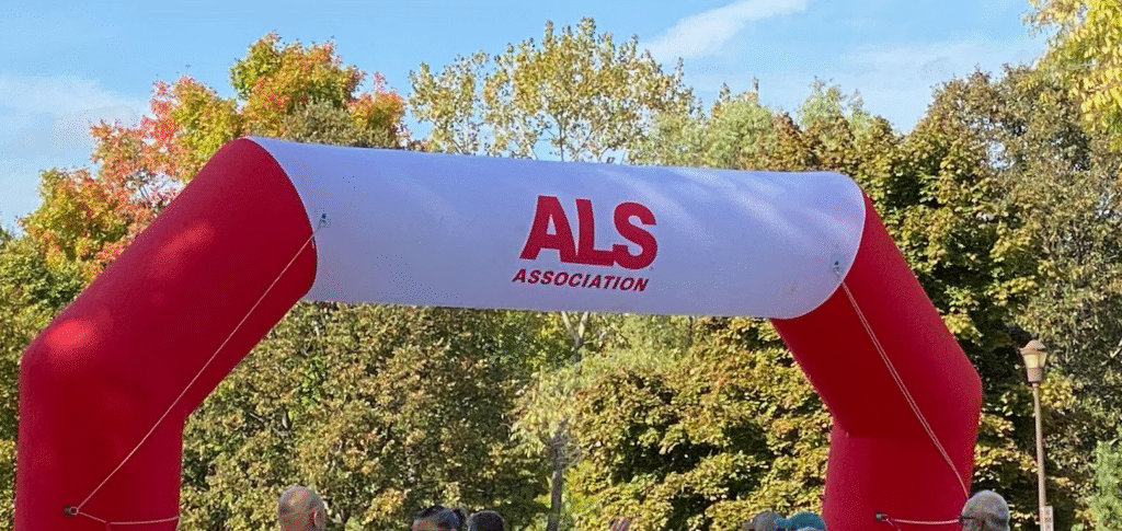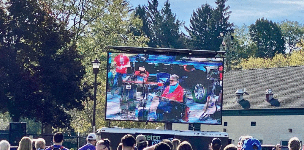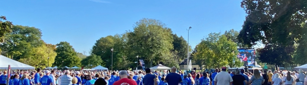 心地よい秋空の下で、歴史あるパーク内の大木の並木の恩恵を受け、涼しいウオークのあと、参加者は地元のレストランから寄付されたハンバーガーやホットドックを楽しむ事ができました。 筆者の夫の高校時代の友人が数年前にALSで亡くなったということもあって、私たちも事前にオンラインで寄付をし、当日はイベントに参加しました。 スピーカーたちの顔が遠くからでも見れるように大きなスクリーンが準備されてあり、またカントリーやロック、ポップミュージックを演奏してくれるバンドもいて、パーク内にはさまざまのギフト店テントも並び、地域のボランティア精神を促すとても活気ある啓蒙イベントでした。